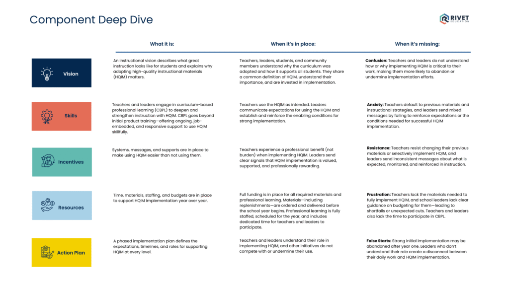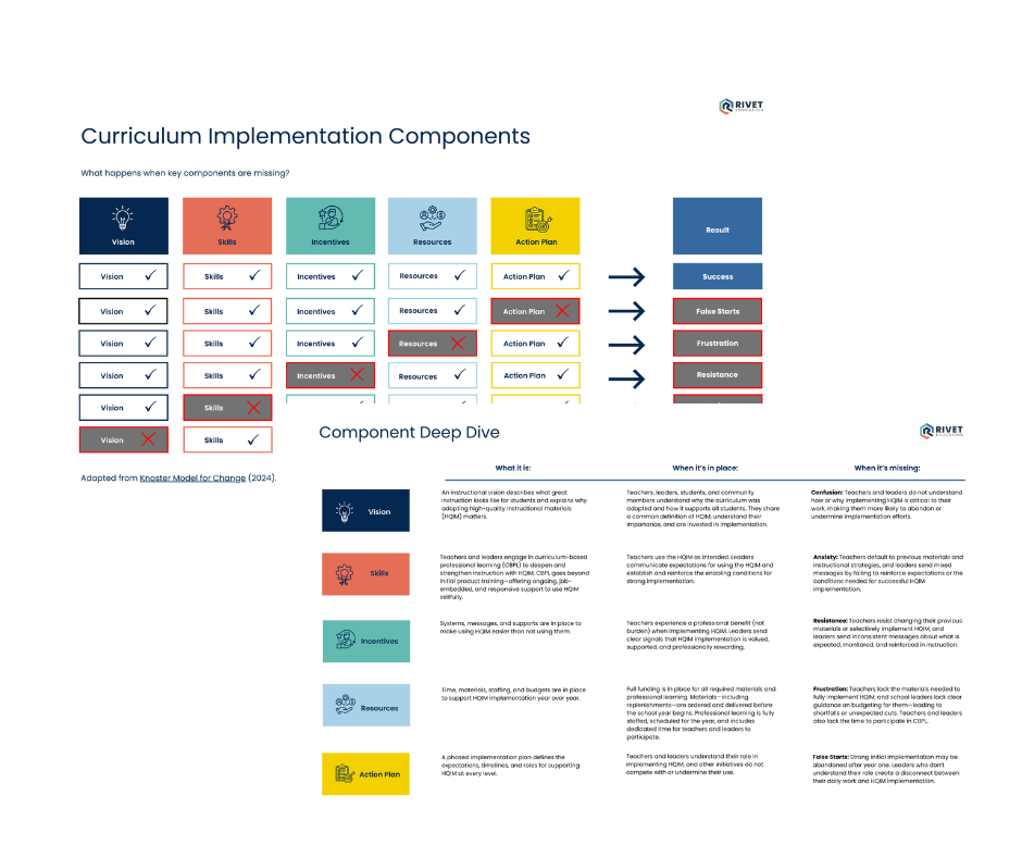 At Rivet, we’ve developed a simple change-management flow adapted from the Knoster Model for Change to help leaders diagnose what’s in place–and what’s missing–in their curriculum implementation. The flow includes five components: Vision, Skills, Incentives, Resources, and an Action Plan. When all five are in place, implementation succeeds. When one is missing, leaders see very predictable challenges.
